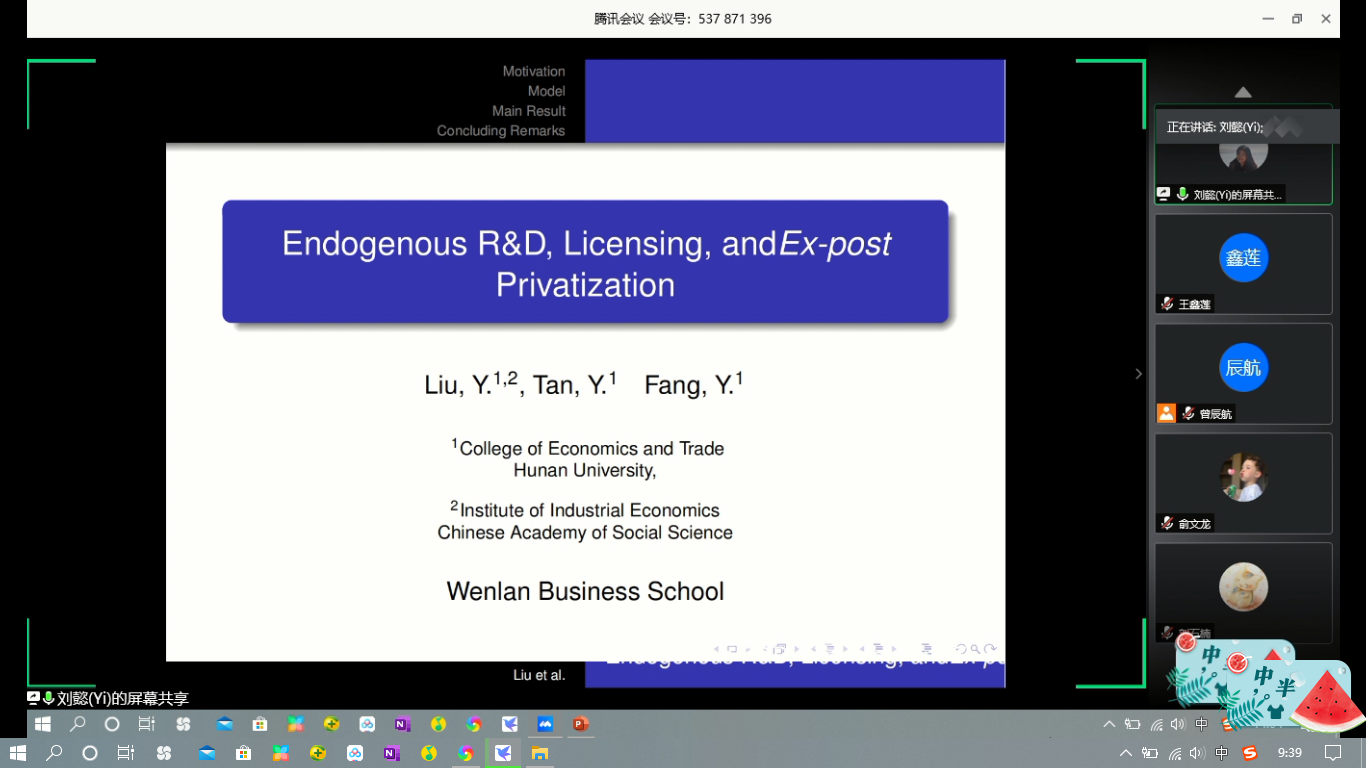 (通讯员:王鑫莲)2020年5月15日下午两点,文澜学术系列讲座在线上平台顺利举办。本次讲座的主题是“Endogenous R&D, Licensing, and Ex-post Privatization” ,主讲人为湖南大学经济与贸易三公赌博 副教授——刘懿老师,她博士毕业于美国南伊利诺伊大学经济系,曾进入中国社科院工业经济研究所博士后流动站和日本东京大学社会科学研究所进行相关研究,目前研究领域主要集中在发展经济学以及工业组织理论等方面。本次讲座由三公赌博技巧大全 的曾辰航老师主持,三公赌博技巧大全 部分师生参与。
