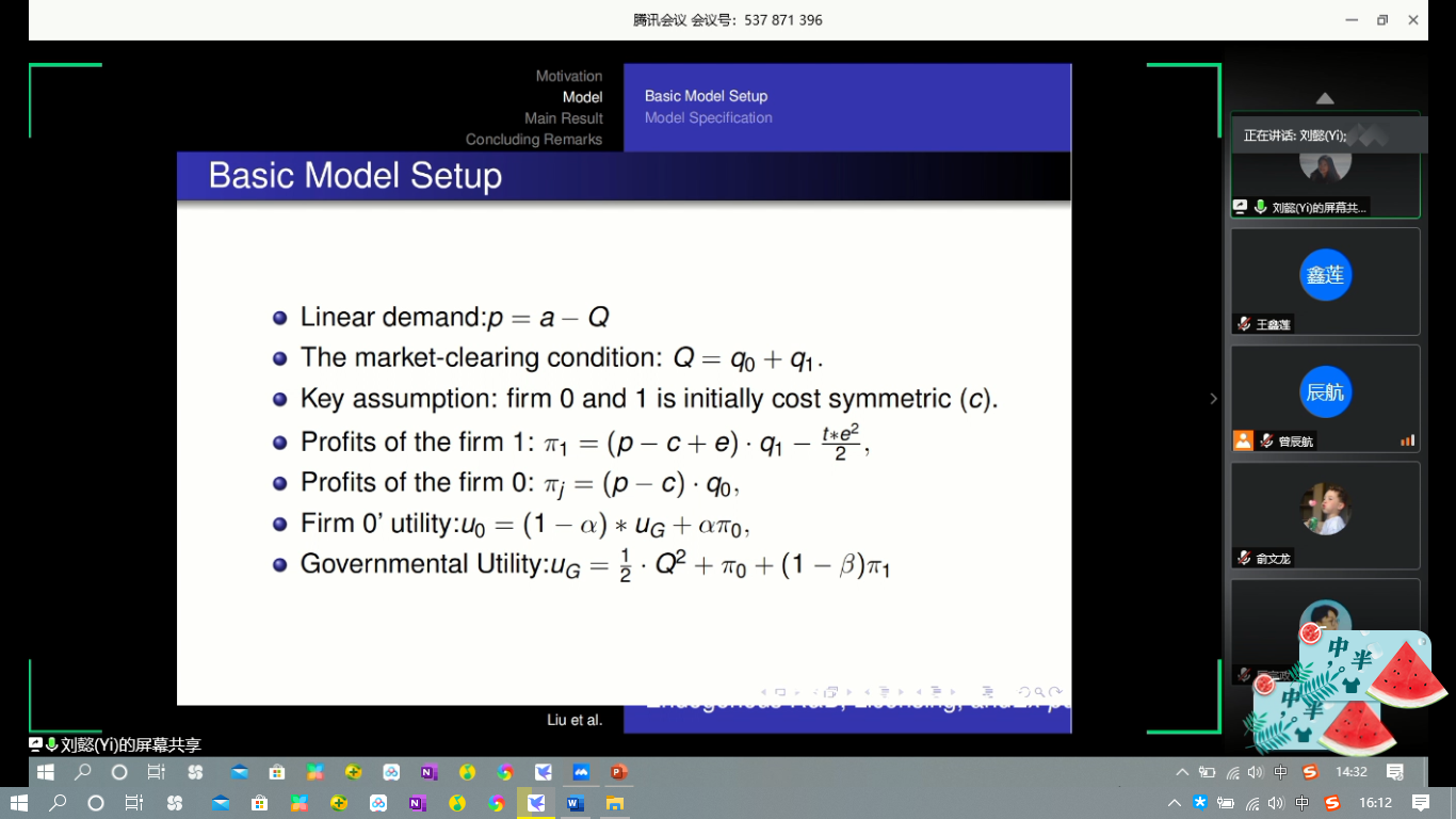 接下来,刘懿老师对文章中的模型设置和其思想进行了细致的讲解。假设市场中存在企业0(国有企业)和企业1(本国或外国民营企业),其中民营企业为研发主体,向国企进行技术授权。并设定了线形需求、市场出清等条件,和企业0、企业1的目标函数。关键假设是两企业最初成本一致。博弈过程为:企业决定自主研发投入;企业决定以单位成本进行技术授权;当地政府出台政策确定民营化水平;两企业进行产量竞争。