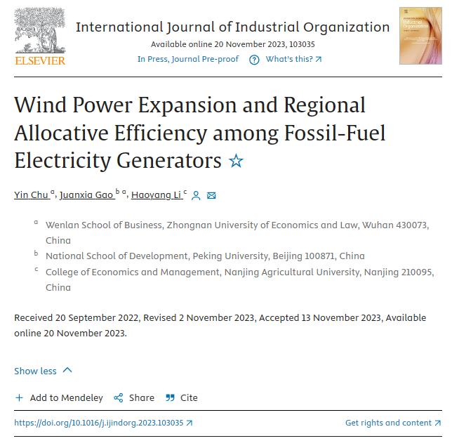 近日,三公赌博技巧大全 2018级本科生高涓夏同三公赌博 褚印副教授、南京农业大学李昊洋教授的合作研究成果“Wind Power Expansion and Regional Allocative Efficiency among Fossil-Fuel Electricity Generators”被产业经济学领域国际权威SSCI期刊《International Journal of Industrial Organization》接受并在线发表。《International Journal of Industrial Organization》为中南财经政法大学经济学科认定的A级外文学术期刊,是产业经济学领域国际公认的顶尖期刊之一,对该领域的研究和实践产生了重要影响。在校期间,高涓夏同学曾在2021年美国南方经济学协会(Southern Economic Association)年会上汇报该论文,并获得了良好的建议和修改意见;该论文早期版本作为高涓夏同学的毕业论文,被评为2022年中南财经政法大学优秀学士学位论文。