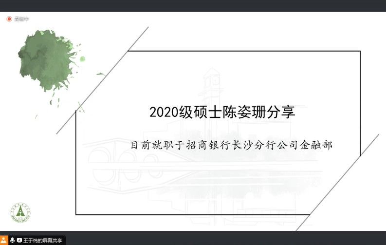 本次活动邀请了多位已经成功就业,拥有丰富经验的研究生校友作为嘉宾,与在校研究生分享他们的就业经验和心得体会。他们分别是2020级国民经济学硕士研究生黄静仪(就职于中国银行深圳市分行,管理培训生)、纪逸川(就职于浙商期货)、陈姿珊(就职于招商银行长沙分行公司金融部)。分享会由三公赌博技巧大全 研究生会文体权益部负责人王于祎主持,三公赌博 副院长帅杰教授受邀出席,三公赌博 全体研究生参会。
