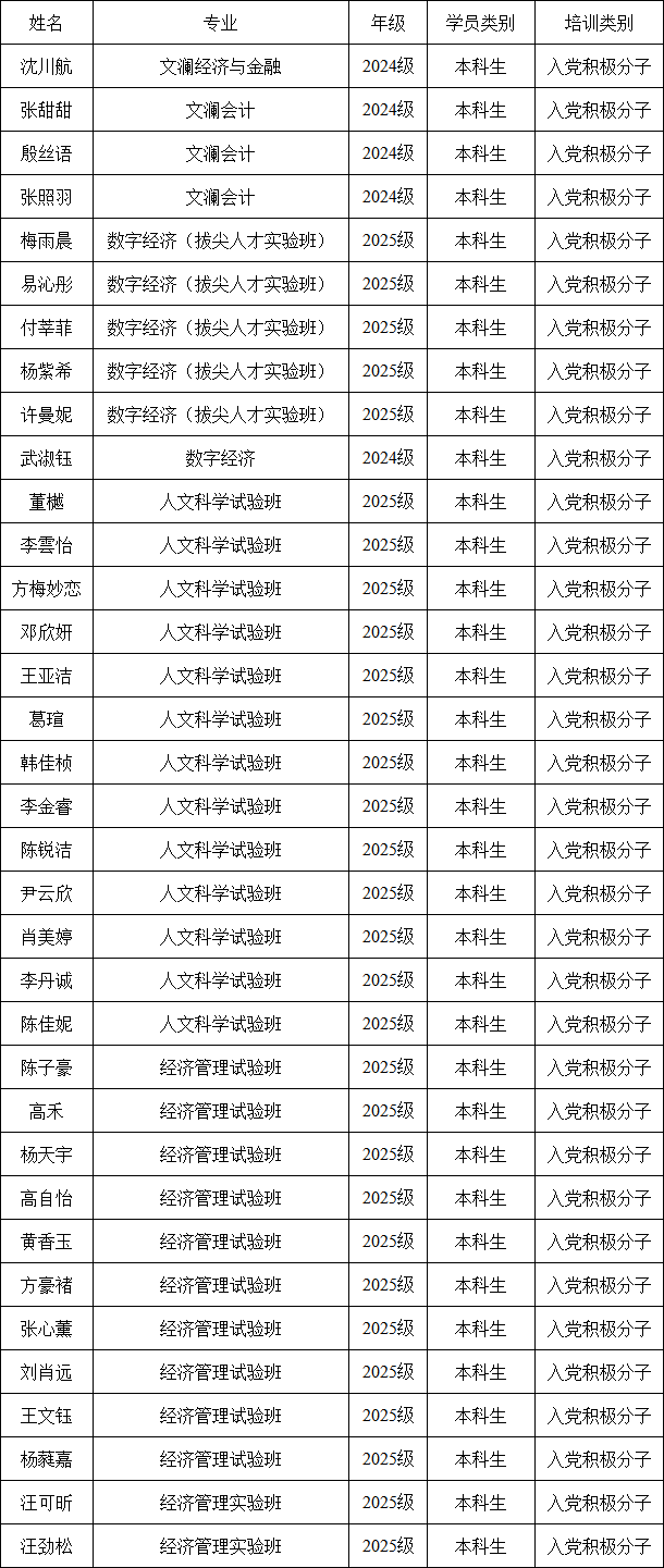 各党支部于2026年4月15日召开会议讨论通过,确定沈川航等同志为入党积极分子,予以公示。现对沈川航等同学在理想信念、政治立场、思想作风、工作、学习、群众观念及廉洁自律等方面接受广大党员、群众监督。